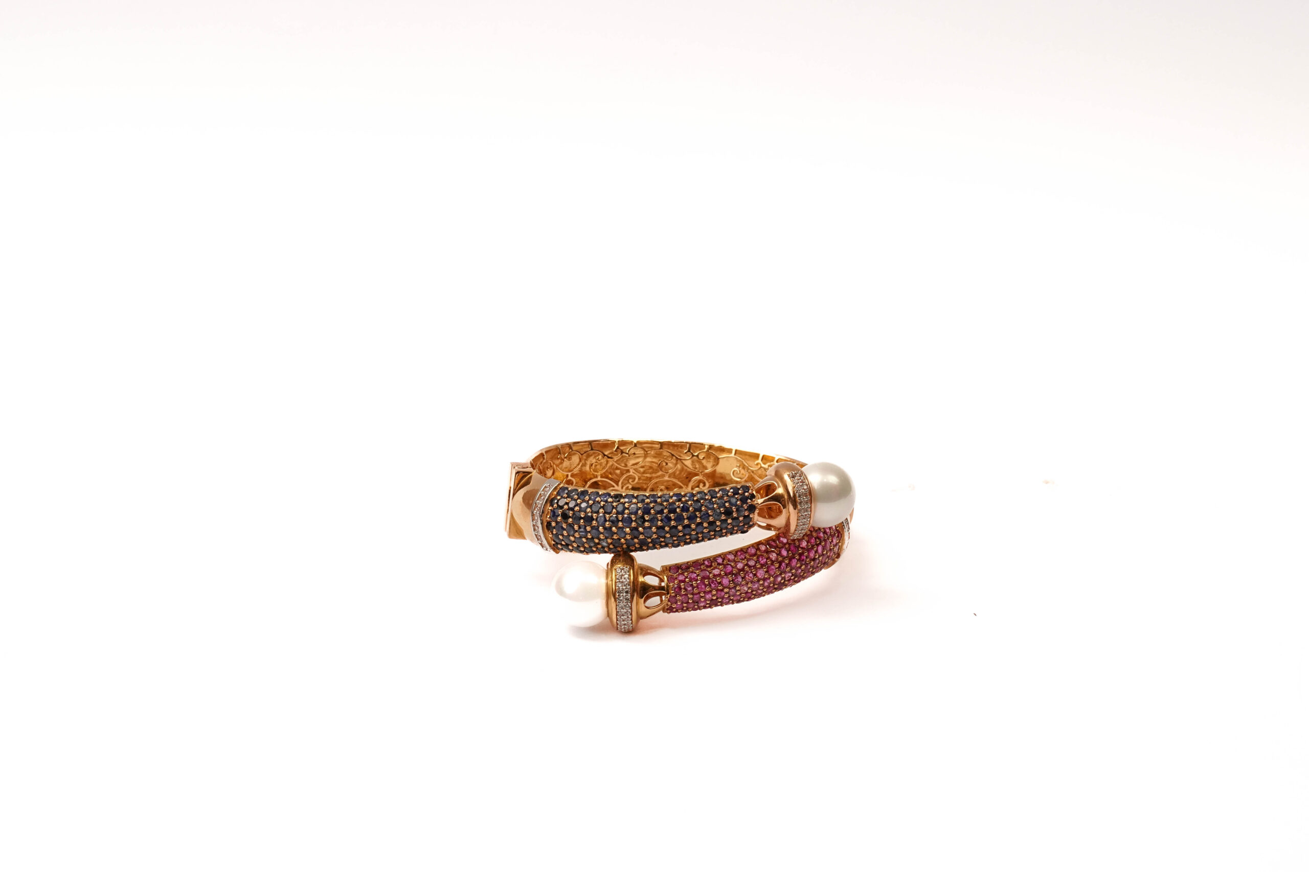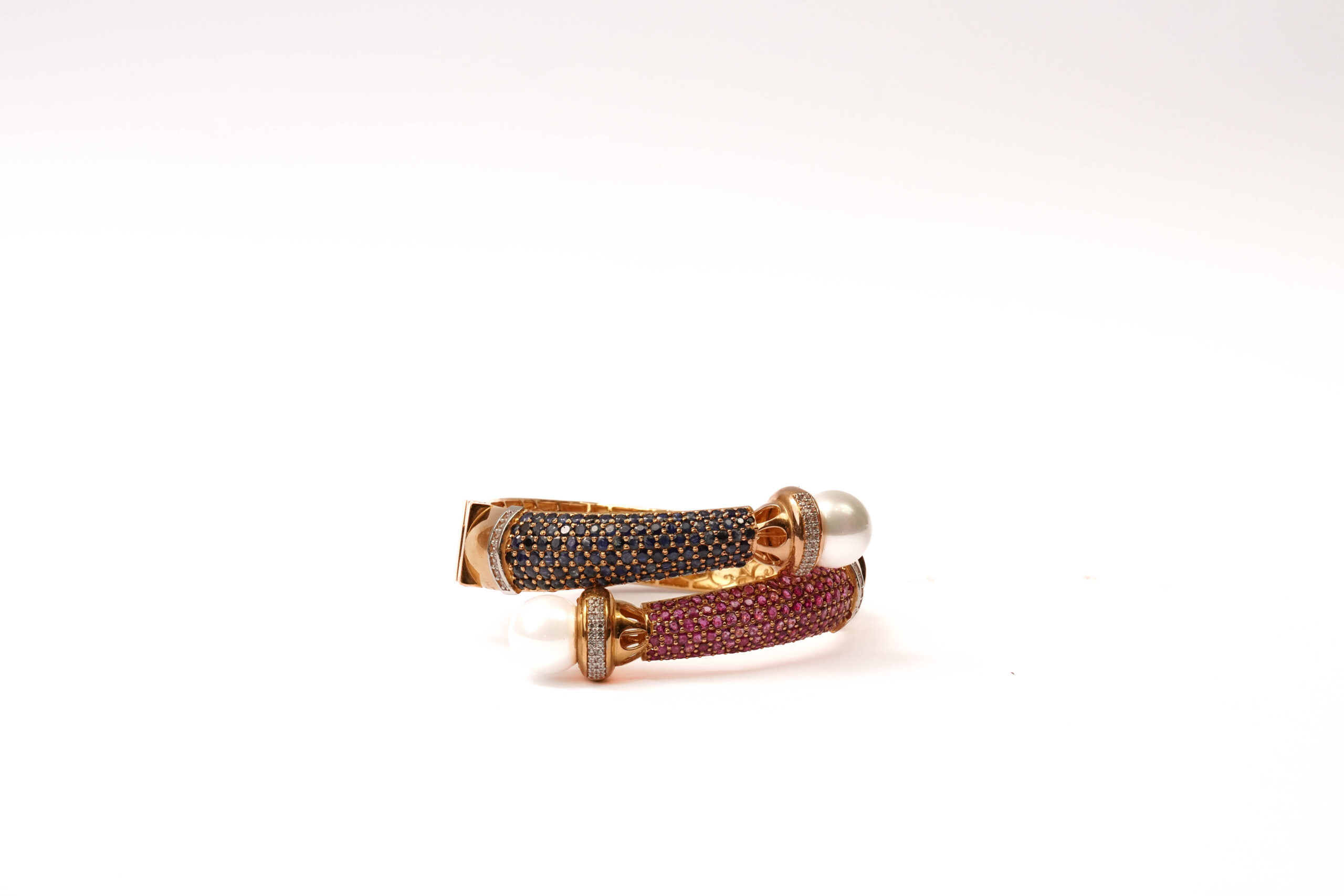 Add these ruby & sapphire bangles with pearl tips to your collection for a look that’s both classic and captivating.